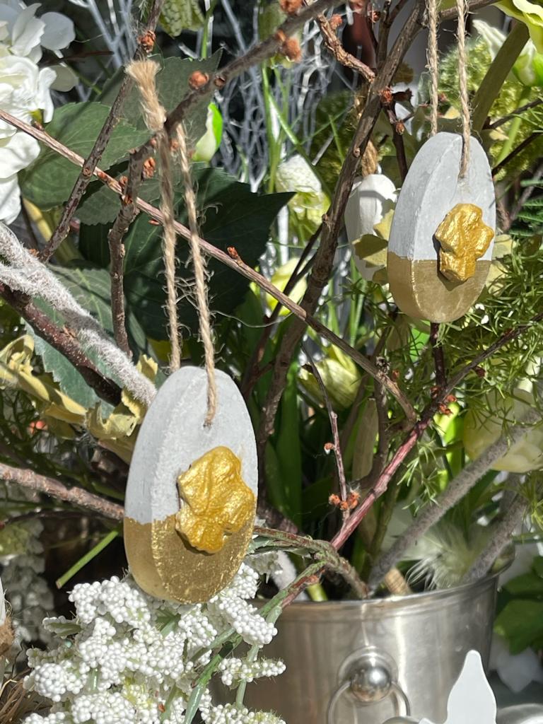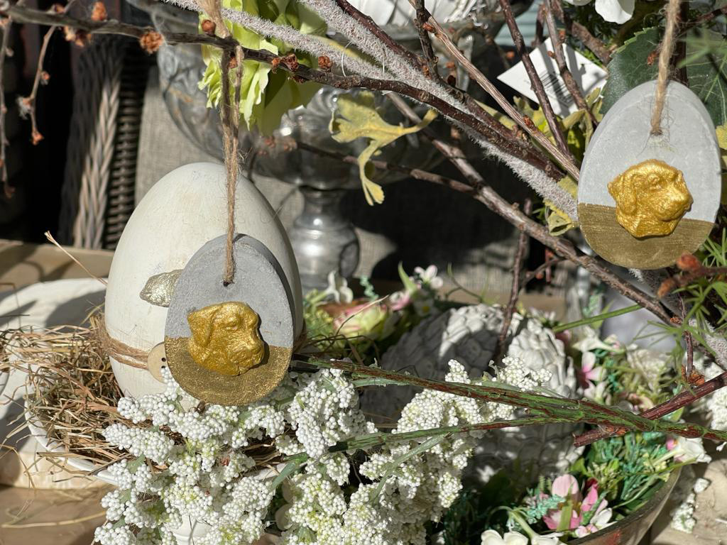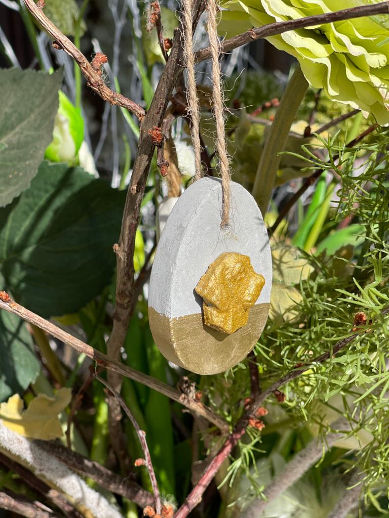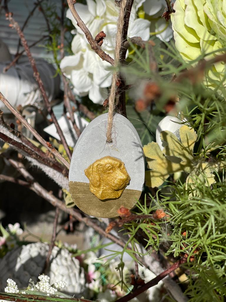 Ein Eiaufhänger aus Beton, halb getaucht in Goldfarbe, gekrönt mit einem 3 D Rauhhaardackelkopf in gold - wenn das mal kein Hingucker ist!