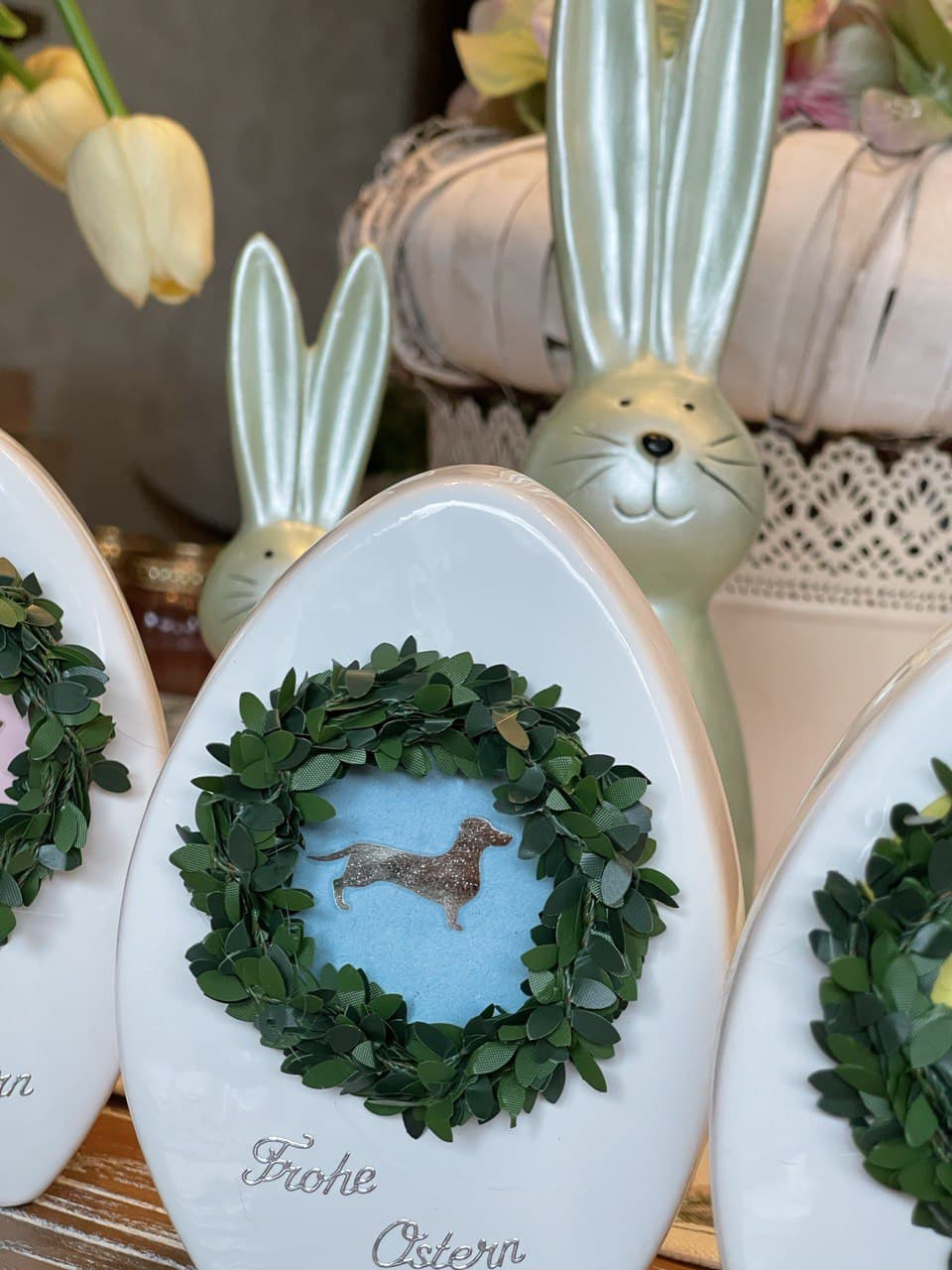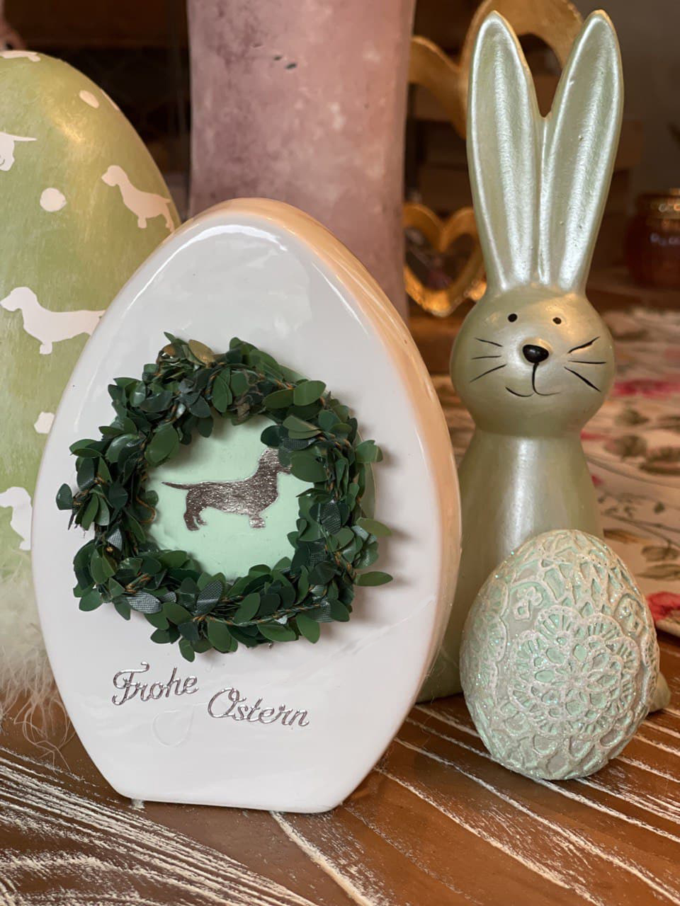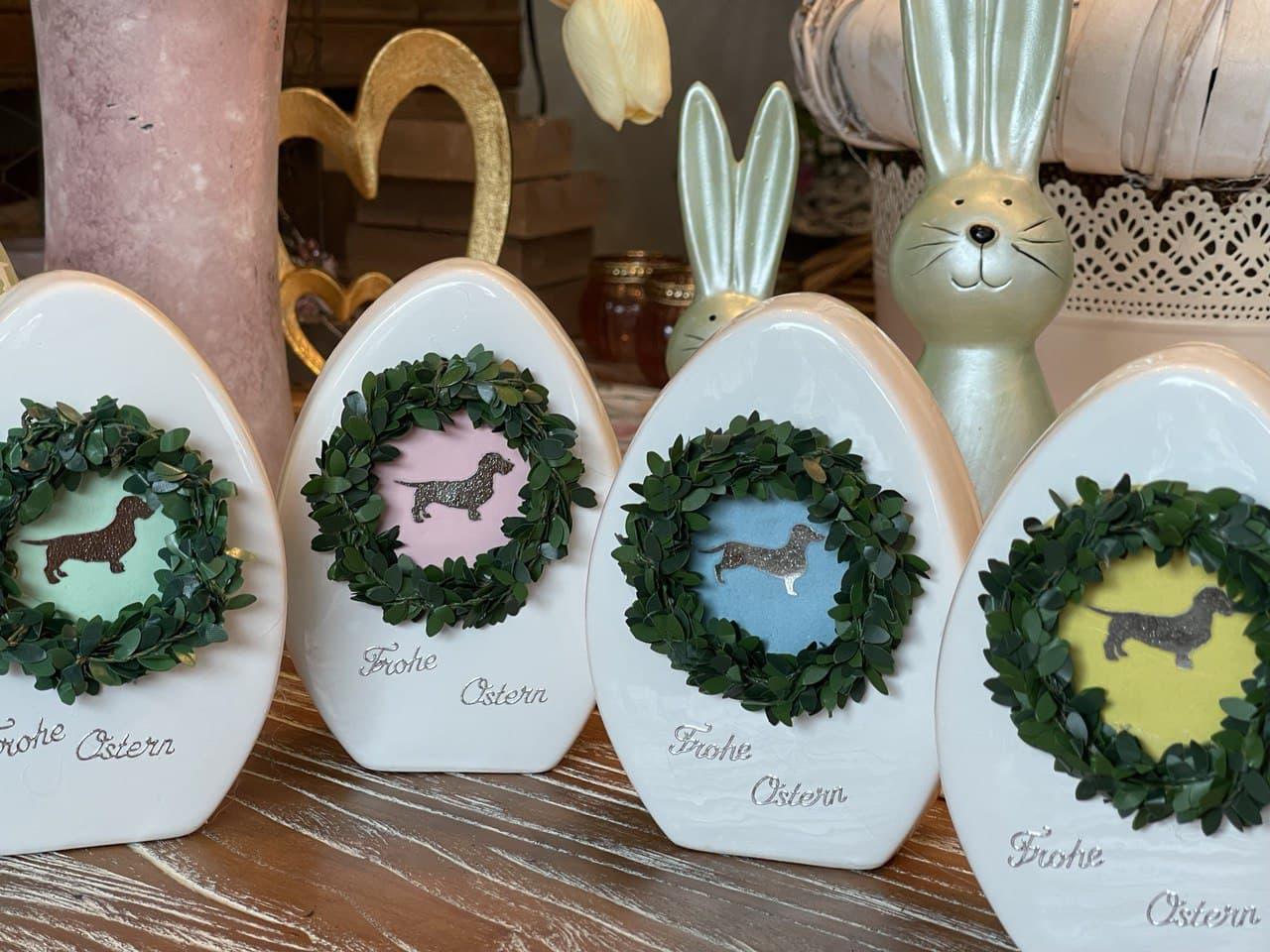 Eiaufsteller Keramik mit Dackel im Buchsbaum