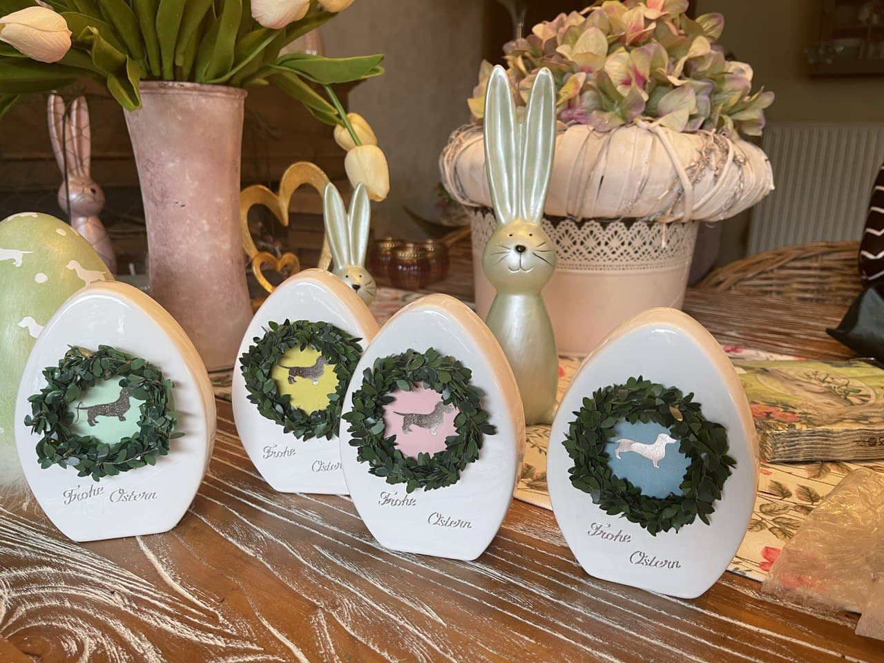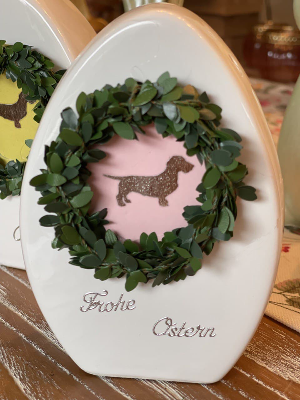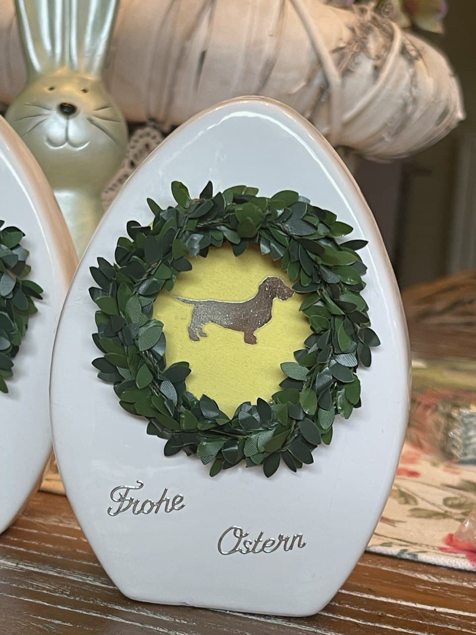 Eiaufsteller Keramik mit Dackel im Buchsbaum