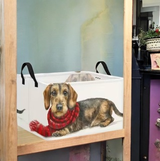 Tolle Faltbox mit einem liegenden Rauhi mit rotem Schal aus Stoff - super zum Aufbewahren von für Hundespielzeug, aber auch als Faltbox im Regal oder Schrank zu gebrauchen - da finden sich zahlreiche Verwendungsmöglichkeiten! Praktisch mit zwei schwarzen Schlaufen.