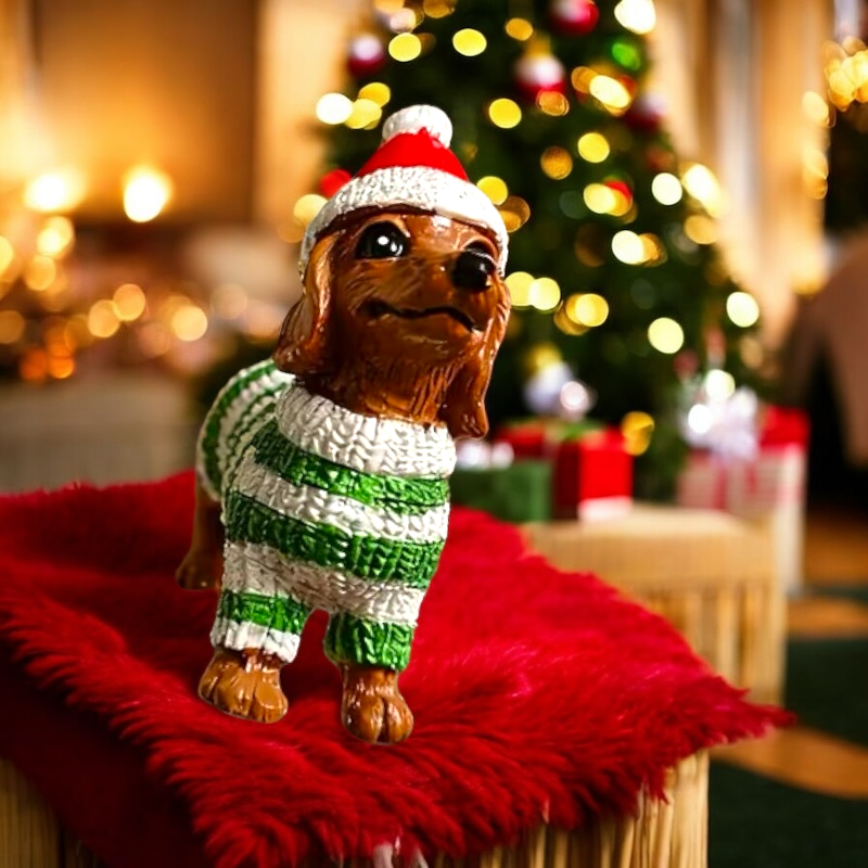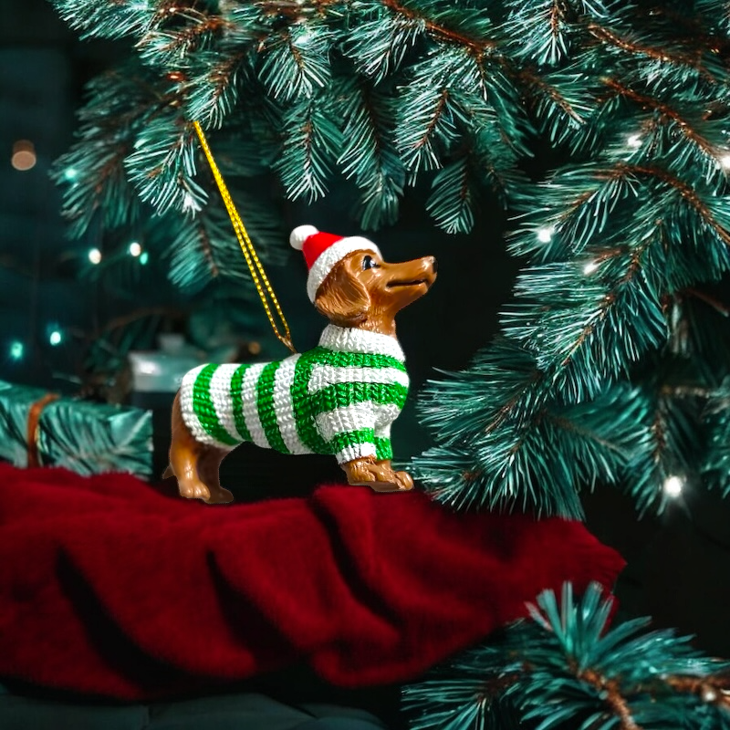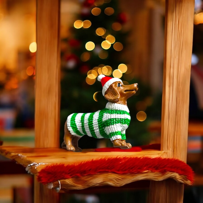 Entzückender Dackelanhänger in grün-weißem Winteroutfit mit Santamütze - zum Aufhängen oder Hinstellen geeignet.