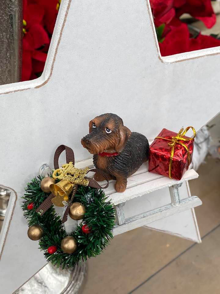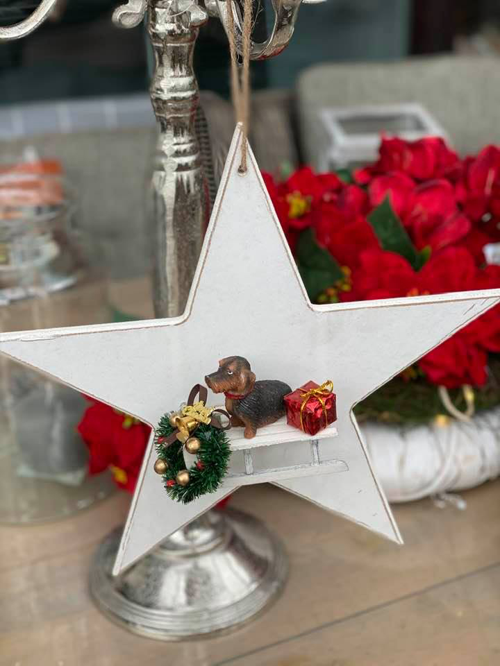 Ein großer weißer Holzstsern mit einem Rauhhaardackel auf einem Schlitten mit einem kleinen Geschenkpaket und einem grünen Weihnachtskranz nebst Glöckchen - zum Aufhängen.