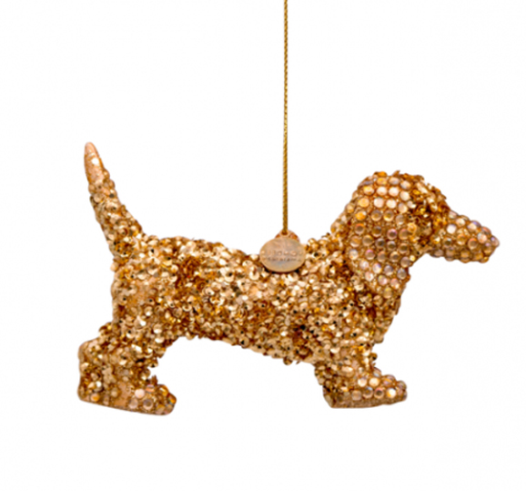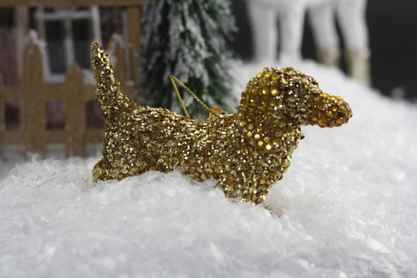 Hier ein Dackel aus Glas in goldenem Gewand in Pailettenoptik - ein echter Hingucker zum fairen Preis!